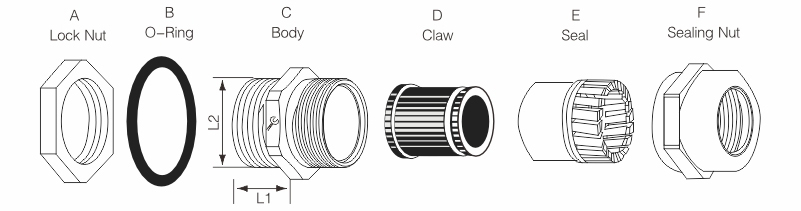 Product Material | Nickel plated brass (body, tightening cap, nut); nitrile rubber (sealing ring, gasket) |