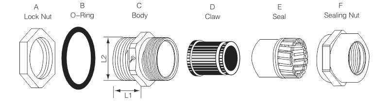 Product Material | Nylon PA66 (body, tightening cap, nut); nitrile rubber (sealing ring, gasket) |